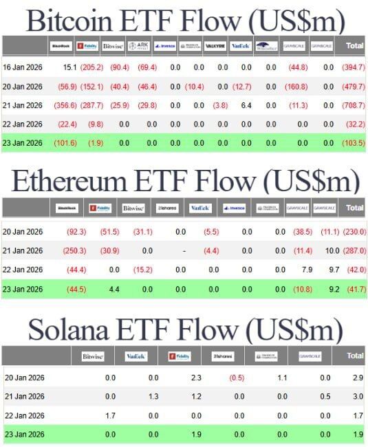 Los ETFs de SOL muestran un desempeño verde constante durante más de dos semanas, contrastando con las grandes salidas netas de los ETFs de ETH y los problemas de XRP.